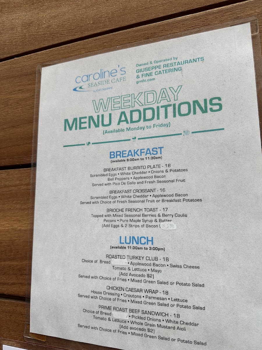 Caroline's Seaside Cafe by Giuseppe Menu